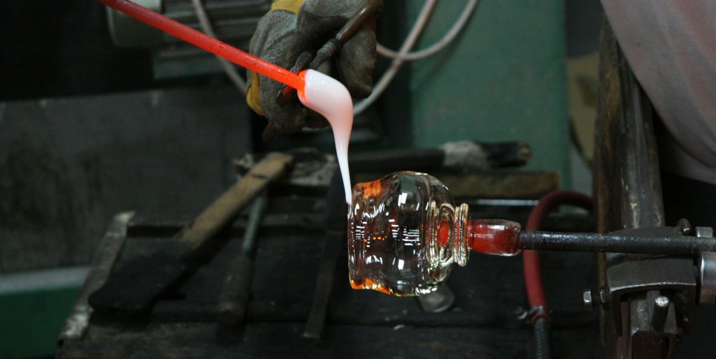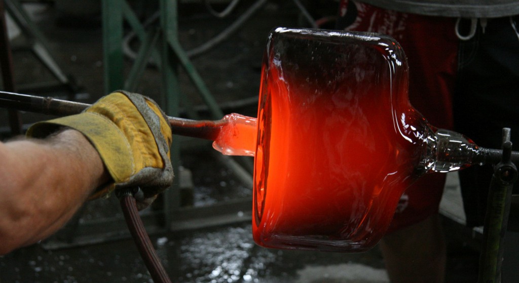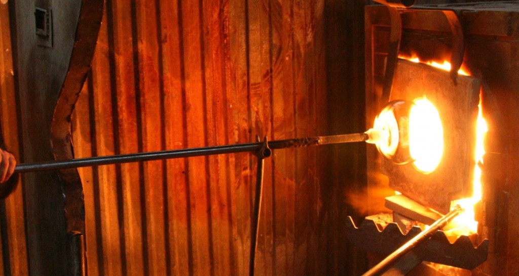 Najpierw przez długą stalową rurę (piszczel), jak przez słomkę wydmuchuje się z płynnego szkła banieczkę starannie i zręcznie tak, by nadać jej określone cechy – zalążek przyszłego kształtu. Banieczka stygnąc twardnieje, co pozwala nabrać na nią właściwą porcję płynnego szkła z pieca, ruchem podobnym do tego, jakim nabieramy płynny miód kręcąc łyżeczką. Toczymy szkło podtrzymując je drewnianą miską z rączką (burgulcem) dmuchając i manipulując nim, by grubość, kształt i rozłożenie szkła powiększającej się bani dokładnie odpowiadały zamierzeniu. Teraz bania ma kształt pękatej gruchy; niezbyt grube dno, a ścianki grubieją ku górze. Podstawa patery jest już prawie gotowa. Żeby wykończyć brzeg i rozwinąć gruchę w płaski talerz trzeba pozbyć się piszczeli. Przymocowujemy zatem do dna, klejąc na gorące szkło, kolejną rurę (heftajzę). Odrywamy niepotrzebną już piszczel i niesiemy banię (ciągle kręcąc) do małego piecyka ziejącego wielkim ogniem (drumli). Szkło bieleje i mięknie, można je teraz wystrzyc – obciąć brzeg nożycami. Grzejemy powtórnie i obwijamy krawędź porcją, półpłynnego. gorącego, kolorowego szkła. Znowu grzejemy do miękkości. Namoczonym (żeby się nie zapaliło) drewienkiem rozszerzamy, grzejemy, rozszerzamy – grucha zamienia się w miskę. W pewnym, precyzyjnie wyczutym momencie zaczynamy obracać heftajzą z przyklejoną miską szybko; coraz szybciej, wykorzystując siłę odśrodkową, aż miska otworzy się całkiem i przybierze kształt płaskiej, dużej patery, a obwijka rozciągnie się i utworzy delikatny kolorowy brzeg. Teraz można już oderwać heftajzę (stąd termin „szkło rwane”), a gotowe szkło umieszczone na widłach odnieść do ciągowni – chodnikowego pieca odprężalniczego. Po paru godzinach podróży przez stopniowo słabnący żar patera wyjeżdża z pieca. Na dnie, jak ślad po pępowinie, pozostała po heftajzie blizna zaświadczająca o szlachetnym, znanym, od wieków sposobie pracy. Oczywiście wymyślono tańsze i szybsze metody przemysłowej produkcji szkieł, wśród których pierwszego i 10- tysięcznego odróżnić nie sposób. W naszym szkle, zarówno w naczyniach, jak i kloszach, robionych archaicznym, całkowicie ręcznym sposobem, czuje się, że powstały z płynnego, elastycznego materiału zastygniętego w ruchu. Cieszy nas też ich różnorodność. Podobnie jak w naturze nie zdarzają się dwa identyczne przedmioty.
